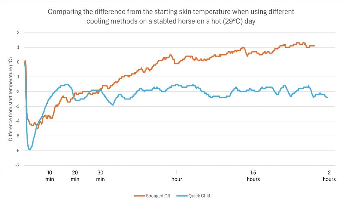 Our in-stable test clearly showed that the Quick Chill Cooling Rug offers effective temperature regulation, outperforming simple sponging by maintaining lower skin temperatures over a longer period—even as the air temperature increased.