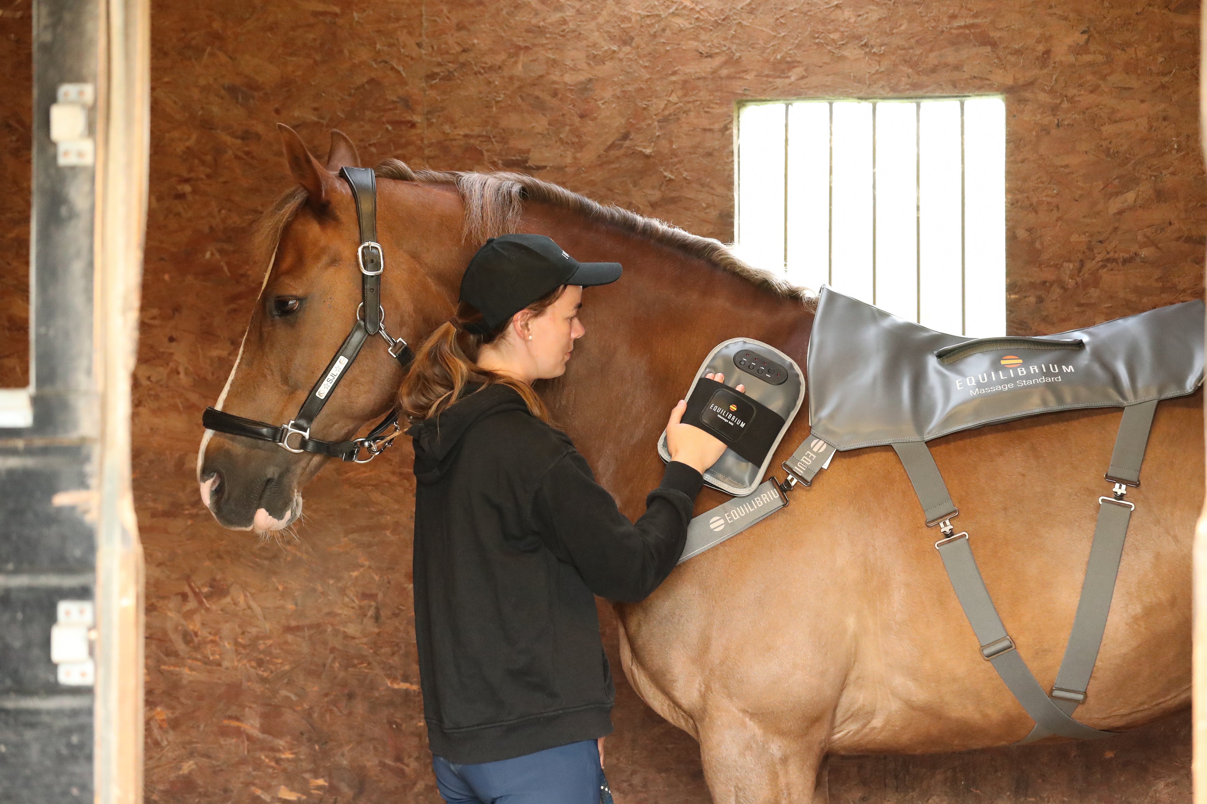 Our collection of re-conditioned Standard Massage Pads have been tested to ensure they are in full working order before they are sent. Re-conditioned pads have been seen by a qualified electrician to check and repaired if necessary, they may have been restitched, they are then fully cleaned and tested before being packed for sale. So you can be sure that if you buy a re-conditioned pad it is in full working order and you are saving one from landfill. Reconditioned Standard Massage Pad sent complete with: • High-Performance Battery & International Charger • Carry bag • 1 Year Product Guarantee The Equilibrium Horse Massage Pad was developed through clinical trials at Myerscough College, UK. The innovative design provides effective, affordable equine massage for horses and ponies sized 14.1hh – 16.1hh or in 5ft9 – 6ft3 sized rugs. Battery operated 30-minute sessions – give your horse or pony a massage while you complete other yard tasks. Choose the intensity of the massage from 3 different programs. Lightweight and portable – take it with you wherever you go. Massage more and charge less with our high-performance battery & universal charger. What are the benefits of massage for horses? Massage is well known for its ‘feel good’ factor and has been shown to aid relaxation, and assist with the maintenance of healthy muscle and muscle function. Tension is often one of the most common reasons for poor performance. By increasing relaxation and improving back flexibility, the negative effects of tension can be reduced. A relaxed horse, with relaxed muscles, will move with fluidity and suppleness which is particularly important for competition horses performing dressage movements, and those jumping technical fences. What is the material used within the Standard Massage Pad? The Massage Pad is made up of polyurethane, or PU, with foam padding. The PU outer makes the product extremely hardwearing, but also hygienic – which is ideal if it is shared between many horses and ponies. It is resistant to water and grease, but also to fungus. This material paired with the padding also makes it comfortable for the horse. Four massage motors are positioned in the target areas for horses and ponies. There are two either side of the wither and another two just behind the saddle area. The careful design of the massage pad then facilitates the spread of the massage along the back muscle. Who is the Standard Massage Pad for? While this Massage Pad is suitable for multiple sizes of horses, the size who most benefit from the standard size are those 14.1hh – 16.1hh, or in 5ft9 to 6ft3 rugs. Pony and XL sizes are available for horses and ponies either side of that range. You can use the horse Massage Pad before riding, after riding or on a day off! Here's a few scenarios: Horses on box rest to maintain good circulation. After exercise to help support recovery. Before exercise as part of warm up. At a show after travelling to relax. On your horse or pony’s day off as general maintenance. Anytime as a reward. How does the Standard Massage Pad work? The control panel allows you to select low, medium or high settings and as a result, you can choose the intensity of the program to suit your pony. Each program runs through a cycle of three different types of massage – pulsing, vibration and stroking –to ensure all muscles are worked in different ways. Choosing your setting: LOW for cool down after exercise, for a sensitive horse or to introduce the pad to your horse for the first time. MEDIUM to warm up the muscles prior to exercise or for general maintenance. HIGH if your horse prefers a more intense massage. The massage pad will run for 30 minutes before turning itself off automatically however, you can manually turn it off sooner if needed. It can be used on its own or in conjunction with the hand-held Massage Mitt for an all over massage, or the Massage Mitt Hotspot to combine heat and massage. Massage Pad Testing: We take pride in researching and testing our products. The Equilibrium Massage Pad was independently tested by Myerscough College in Lancashire, UK. The results, following six weeks of testing, showed that the massage pad offers significant benefits to horses. A significant increase in back flexibility and relaxation was noted, but it also showed an increase in stride length.