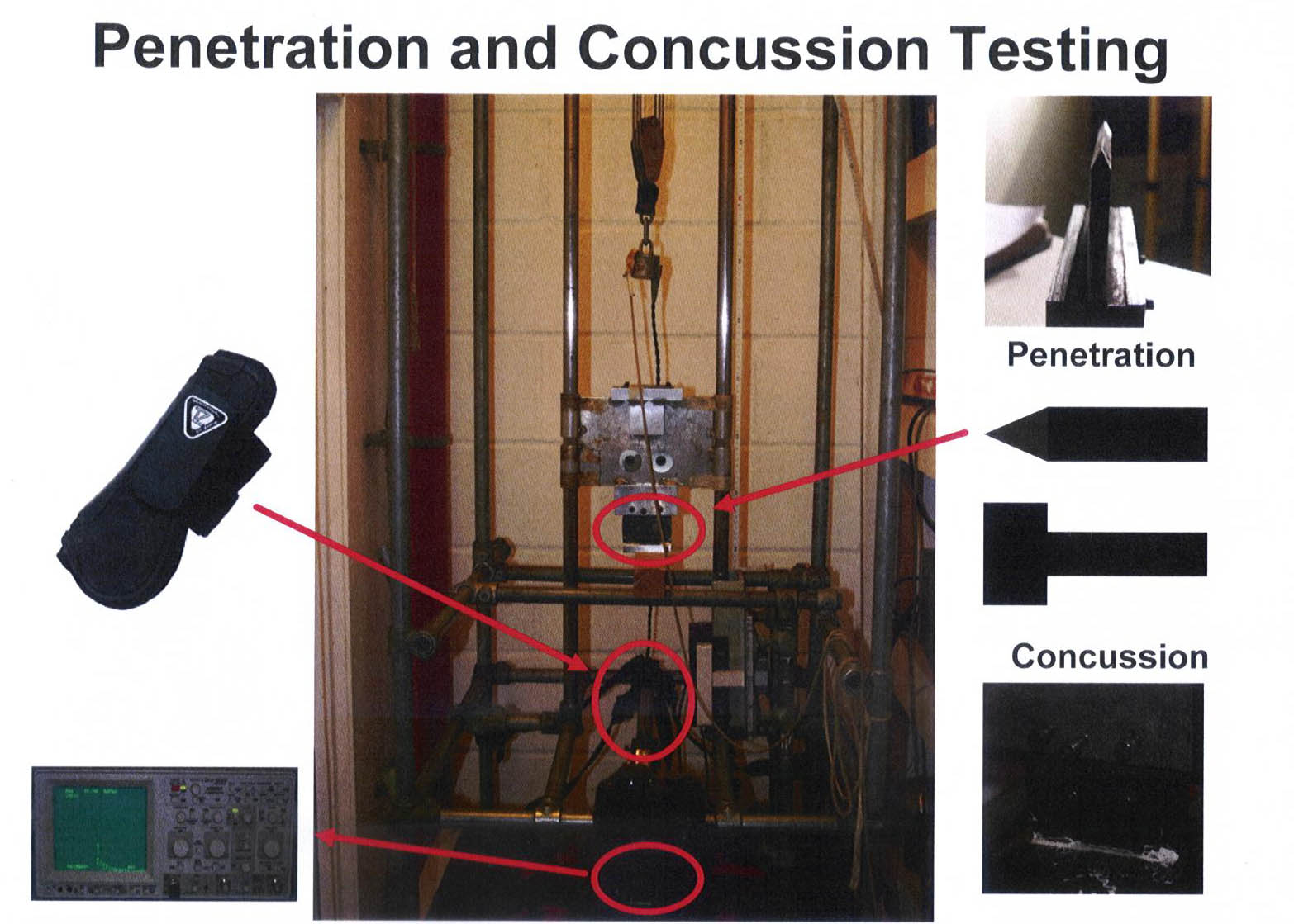 For concussion and penetration the testing is carried out using a custom made test rig consisting of a tower from which either a blunt hammer or a cutting blade is dropped onto the boots in a controlled fashion. The weight of the blade and hammer are fixed and different forces are applied to the boots by varying the height from which they were dropped onto the boots. Boots were hit with forces ranging from 1.25 to 20 Joules. These forces were chosen as being those likely to occur in the horse during exercise, for example when hitting obstacles or over-reaching.